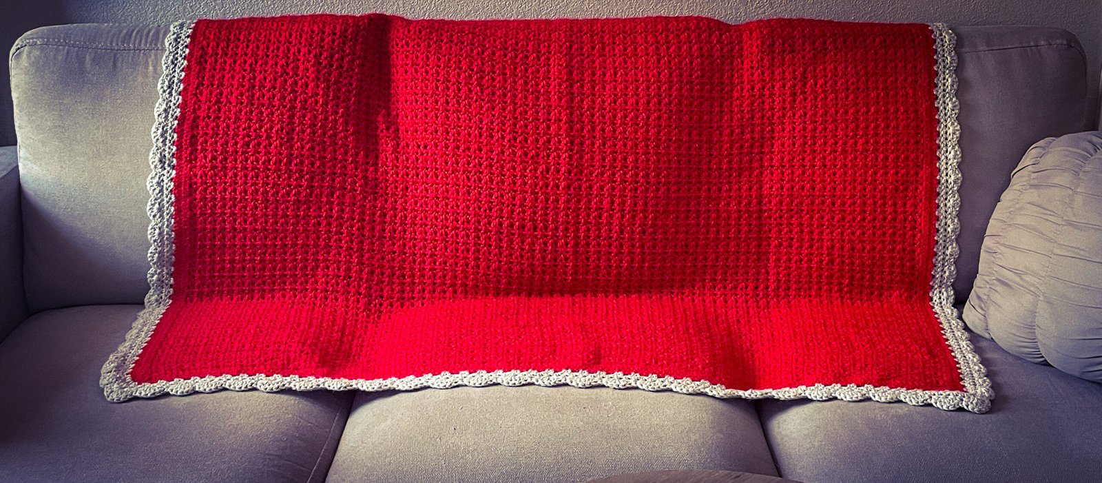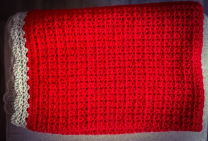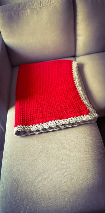 Beautiful decorative Red and Gray Crochet Blanket made with a v-stitch and a shell border. Made with 100% acrylic yarn. Approximate size 37 in. x 48 in. Care instructions: Machine wash cold on delicate cycle, lay flat to dry or tumble dry low heat.